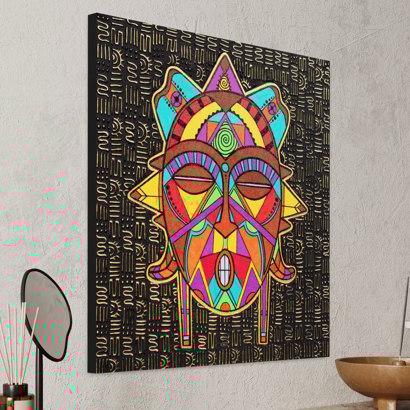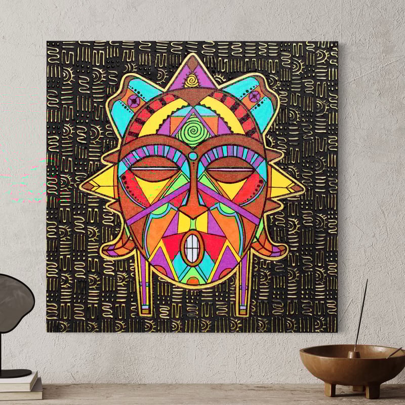 This is a Original 24x24 hand painted abstract African mask. Titled “Mask No. 3”