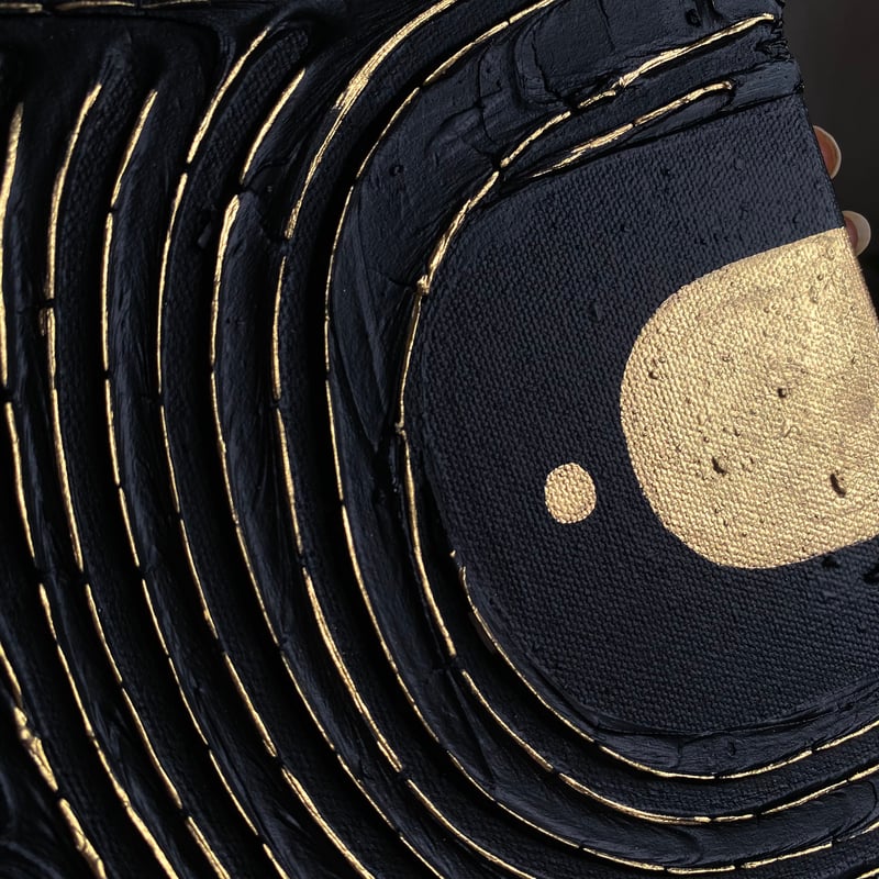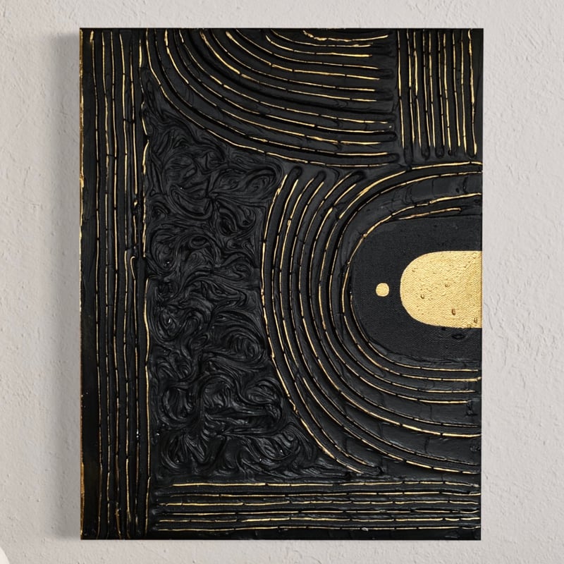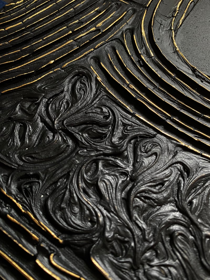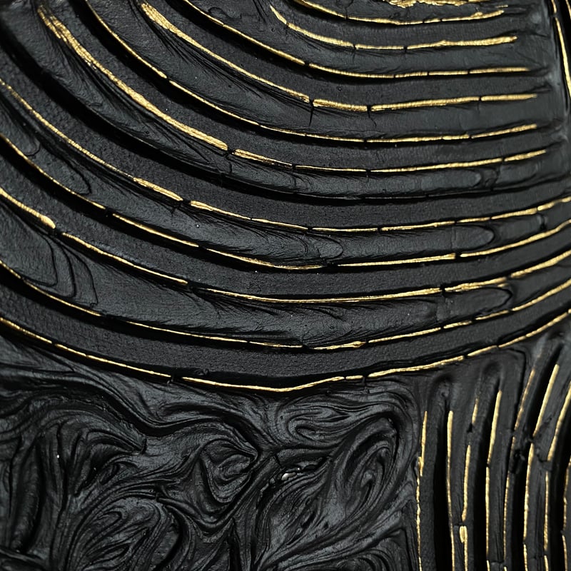 This piece of art is meant to inspire meditation. The contrast and patterns of black and gold are similar to a labyrinth that assist you to reach a deeper meditative state while passing through it.